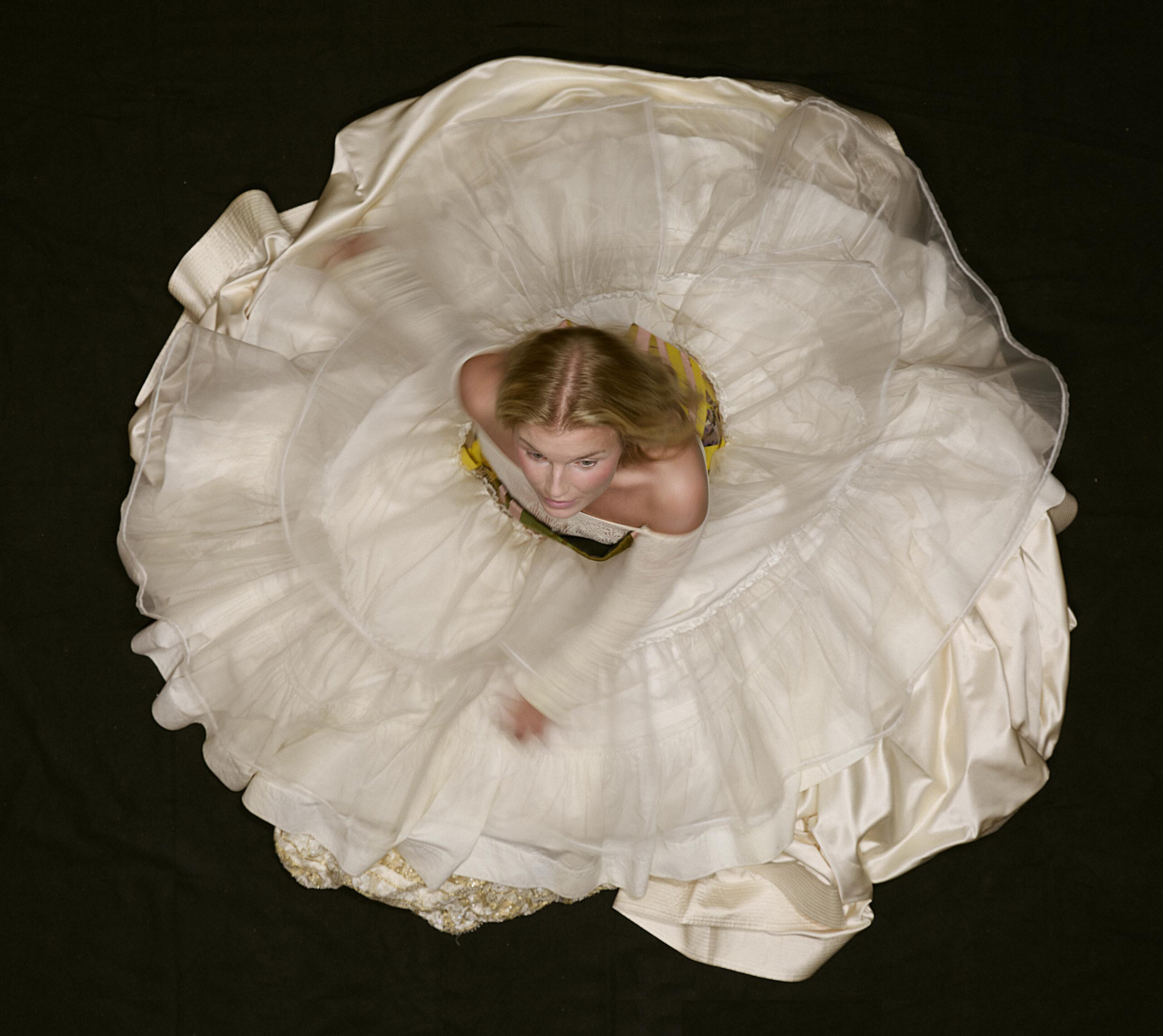 – Blomman, liksom ögat och himlakroppen är universella för oss människor, primära men komplexa former som har blivit något jag återvänder till. Jag har gjort en hel svit filmer och fotografiska verk med början 1996, av en kvinna som hänger uppochner. Många har associerat hennes gestalt till just en blomma. Nu spinner jag vidare på temat för Majblomman, men motivet ses uppifrån i stället för underifrån. Agnes, min dotter är modell, vilket känns väldigt roligt. Hon har stått modell för mina skulpturer förut, och nu gör vi något nytt tillsammans.