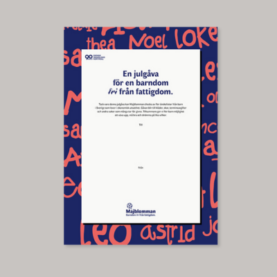 Välkommen till BlombutikenHär kan du köpa majblommor och andra produkter från tidigare år. Pengarna från försäljningen går till vårt arbete mot barnfattigdomen i Sverige. Tack för ditt stöd! Affisch Årets konstnär 2025 300.00 kr Lägg till i varukorg Vykort Årets konstnär 2025 100.00 kr Lägg till i varukorg 121 sidor av Sverige 100.00 kr Lägg till i varukorg Niobladsblomman 2025 100.00 kr Lägg till i varukorg Lilla blompaketet 2025 60.00 kr Lägg till i varukorg Stora blompaketet 2025 190.00 kr Lägg till i varukorg Digital niobladsblomma 2025 100.00 kr Lägg till i varukorg Stora blompaketet 2024 190.00 kr Lägg till i varukorg Metallpins 70.00 kr Välj alternativ Den här produkten har flera varianter. De olika alternativen kan väljas på produktsidan Årets konstverk 2024 899.00 kr Välj alternativ Årets konstverk 2023 5,000.00 kr Lägg till i varukorg Affisch med alla majblommor 125.00 kr Lägg till i varukorg Vykort Carl Larsson 5-pack 150.00 kr Lägg till i varukorg Tygkasse ”Inget barn i Sverige” 120.00 kr Lägg till i varukorg Stora blompaketet 2023 190.00 kr Lägg till i varukorg Lilla paketet 2022 60.00 kr Lägg till i varukorg Majblomman 2021 100.00 kr Lägg till i varukorg Tidigare majblommeaffischer 200.00 kr Välj alternativ Den här produkten har flera varianter. De olika alternativen kan väljas på produktsidan Bli månadsgivare Läs mer