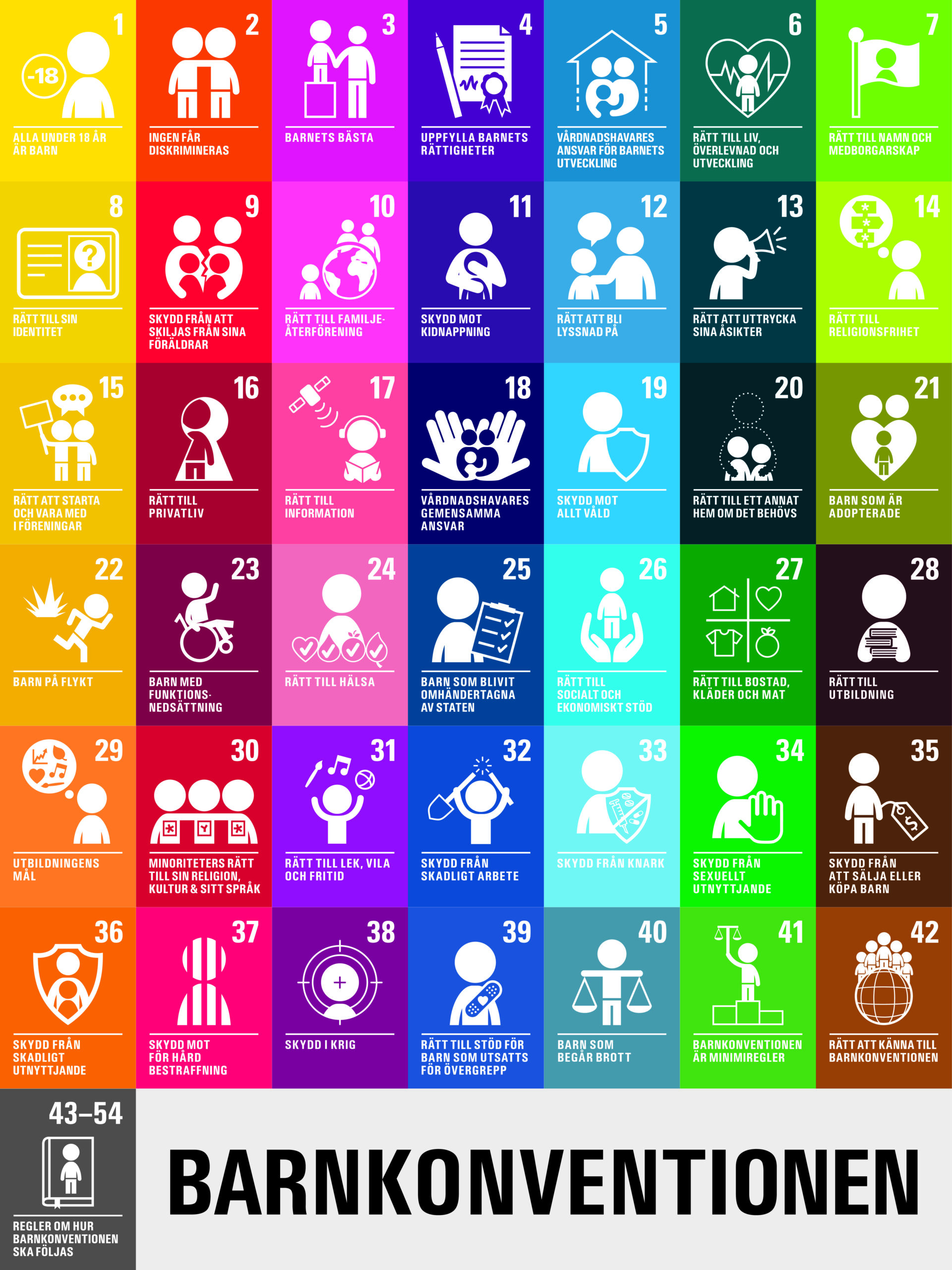 Sedan den 1 januari 2020 är barnkonventionen svensk lag. Konventionen består av 54 artiklar som bland annat beskriver barns rätt till skälig levnadsstandard, trygghet, utveckling, delaktighet och likabehandling.