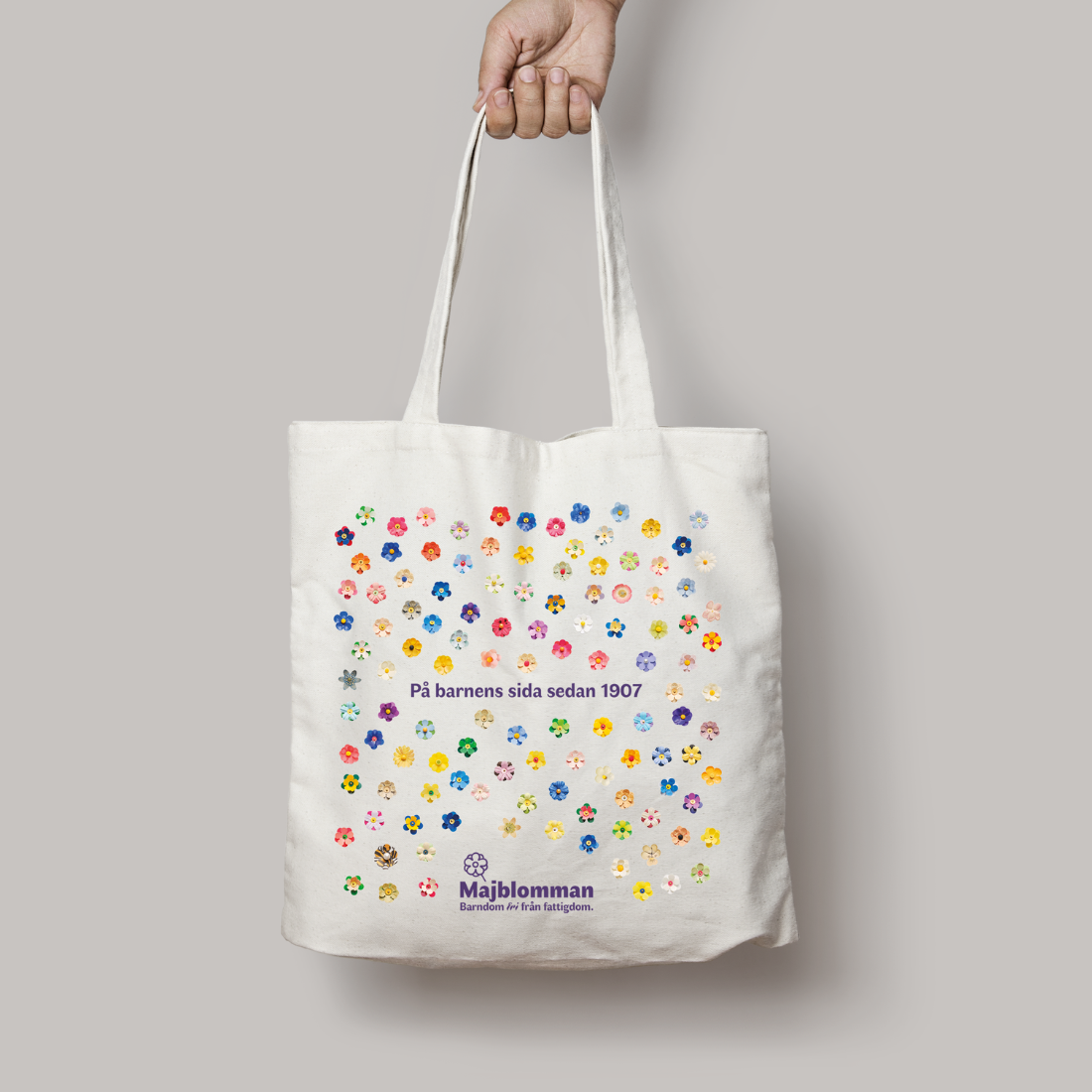 Tygkasse med motiv av olika majblommor från historien, med texten ”På barnens sida sedan 1907”. Kassen har långa bärhandtag och kan bäras både i handen och över axeln.