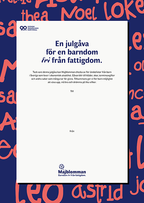 Stort tack för att du gett en hyllningsgåva till Majblomman och stöttar vårt arbete mot barnfattigdomen i Sverige. Med din hjälp kan vi hjälpa fler barn som lever i ekonomisk utsatthet.